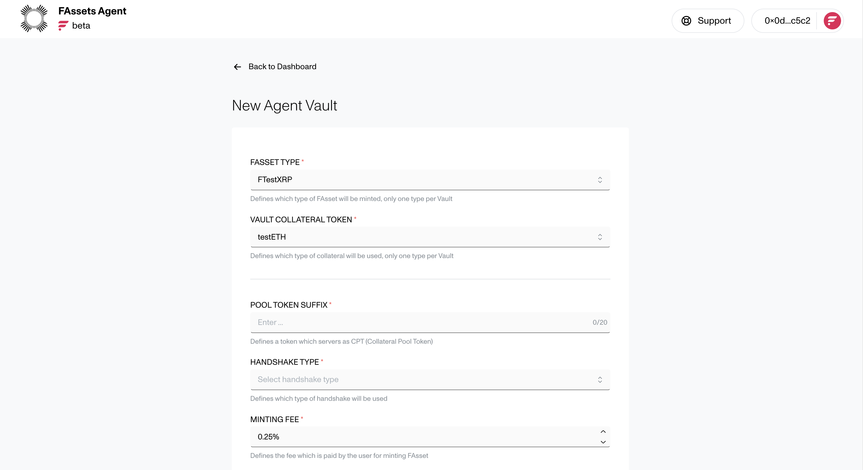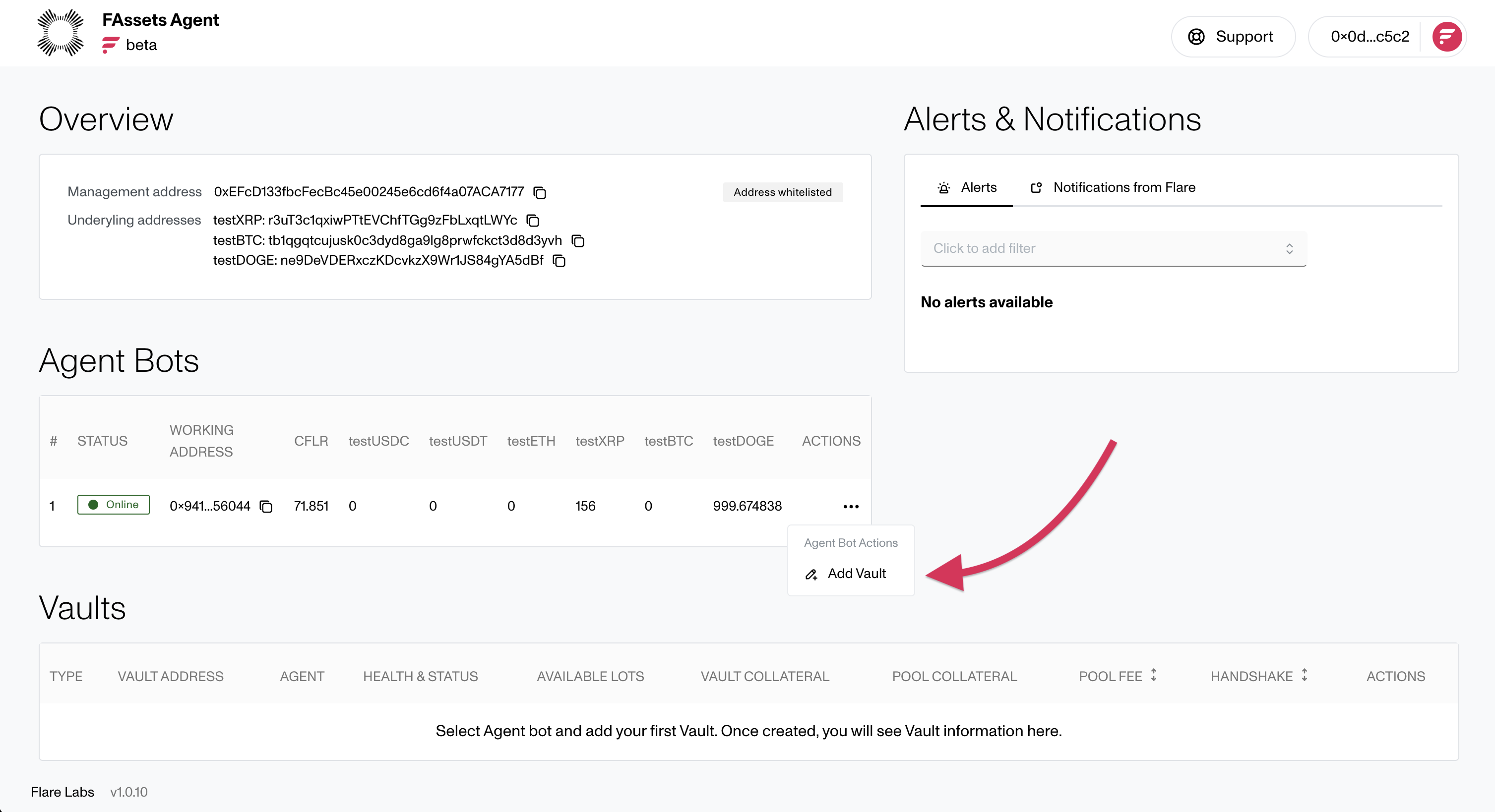 The FAssets Agent user interface (UI) is designed to provide a seamless and intuitive experience for users managing the FAssets agent. It allows users to monitor the agent bot and create and manage FAssets agent vaults.