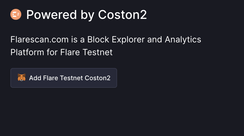Add the Flare Testnet Coston2 to your MetaMask wallet. Go to the Coston2 Explorer, scroll to the footer of the page and click on Add Flare Testnet Coston2.