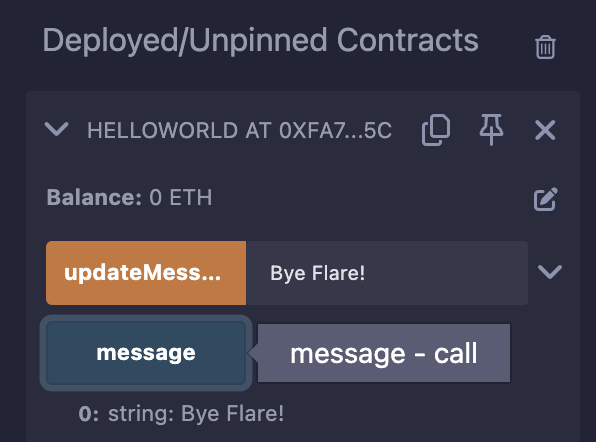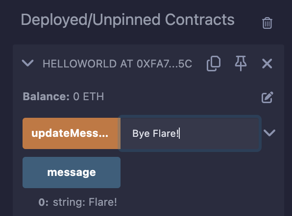 In your deployed contract, enter a new message next to the updateMessage function. Click the updateMessage button to set the new message in the contract data.