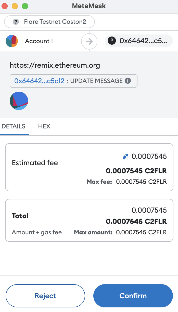 Click the Deploy button to deploy the contract and its initial message to the blockchain. MetaMask opens and asks you to confirm payment to deploy the contract. Make sure MetaMask is set to the Flare Testnet Coston2 network before you accept the transaction. Click on Confirm.