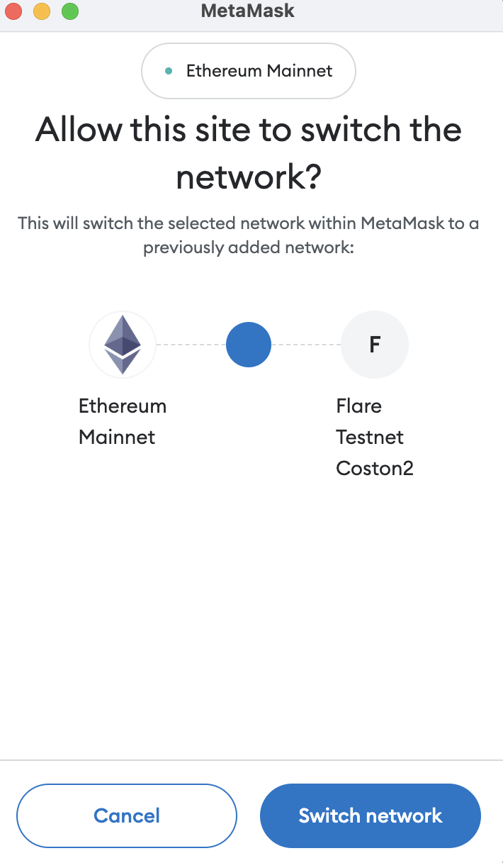 Once approved, MetaMask will ask you to switch to Flare Testnet Coston2. Click on Switch network.
