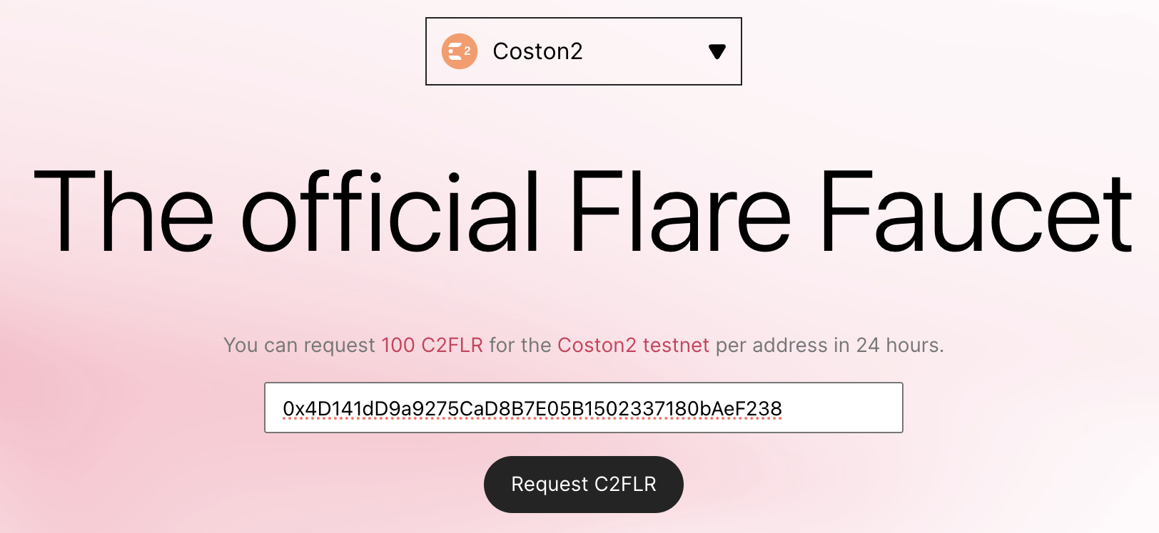 Paste your address in the Coston2 Faucet and click on Request C2FLR.