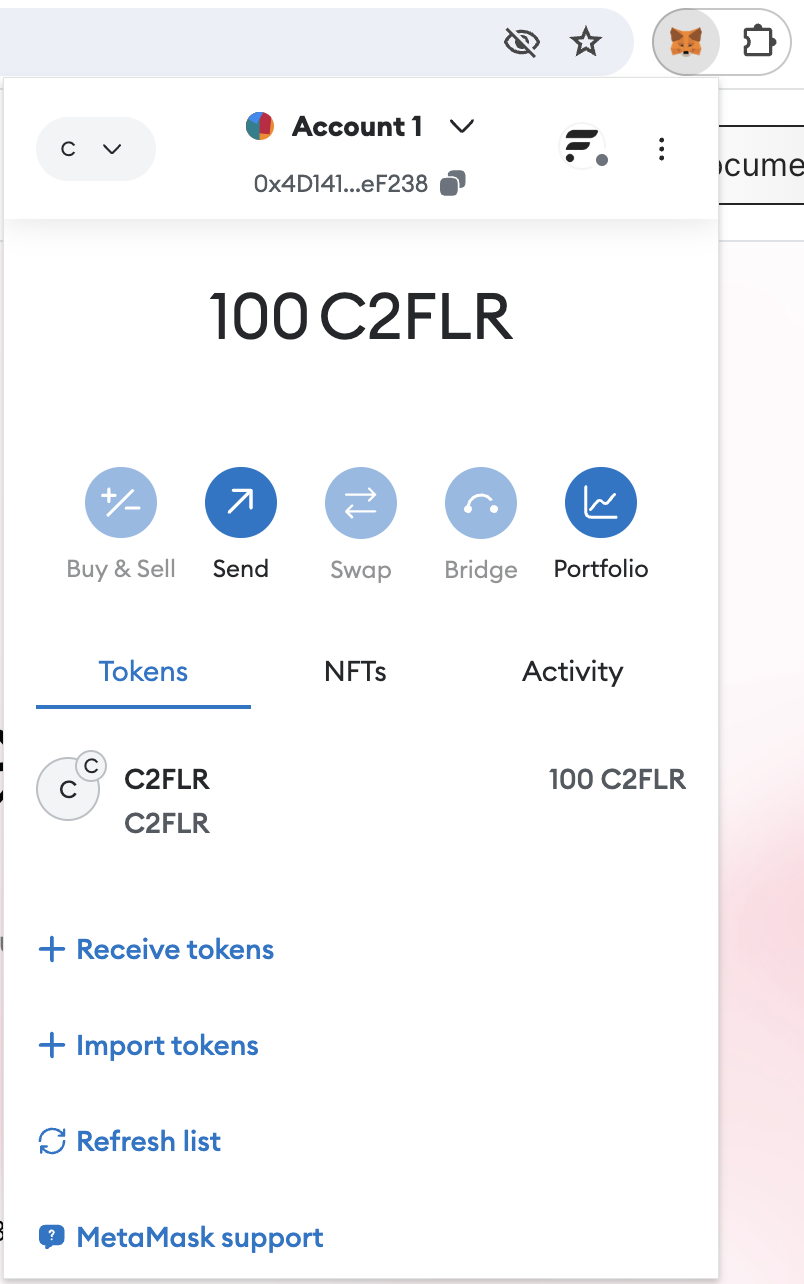 After the faucet completes the transaction, which can take a few seconds, you should find testnet C2FLR in your MetaMask wallet.