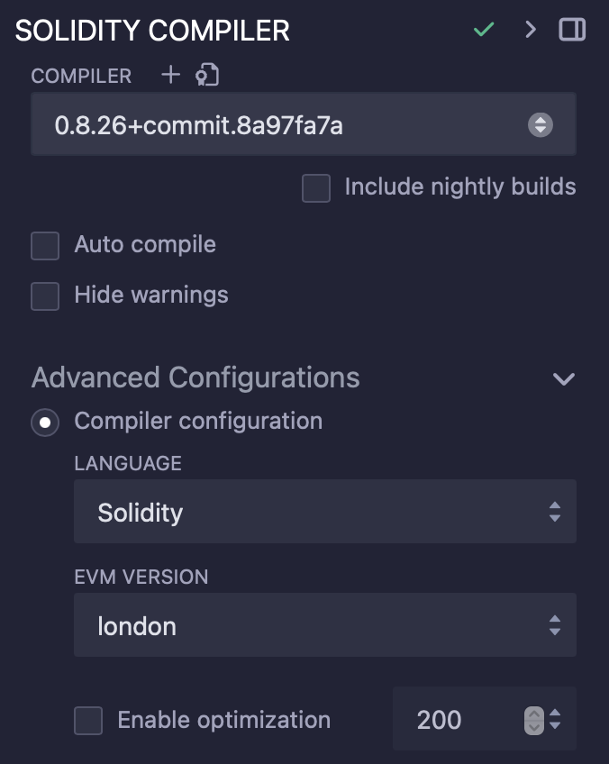 Navigate to the Solidity compiler tab on the left to view the compiler settings.
